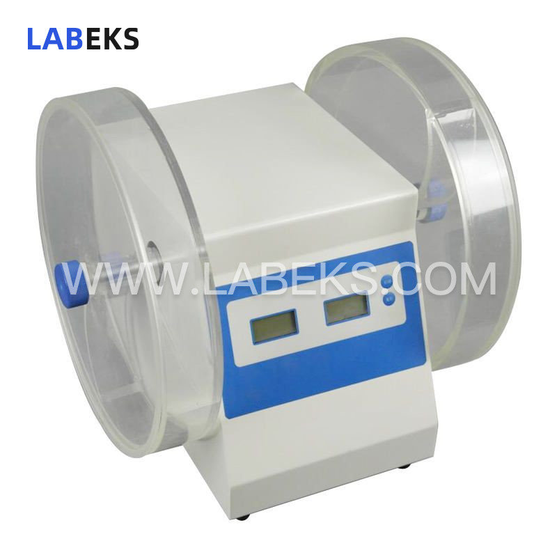 To evaluate tablet durability during packaging and transit, this tablet friability tester repeatedly drops sample tablets in a rotating baffled drum over a fixed period, then inspects for broken units and measures the percentage of mass lost to chipping.