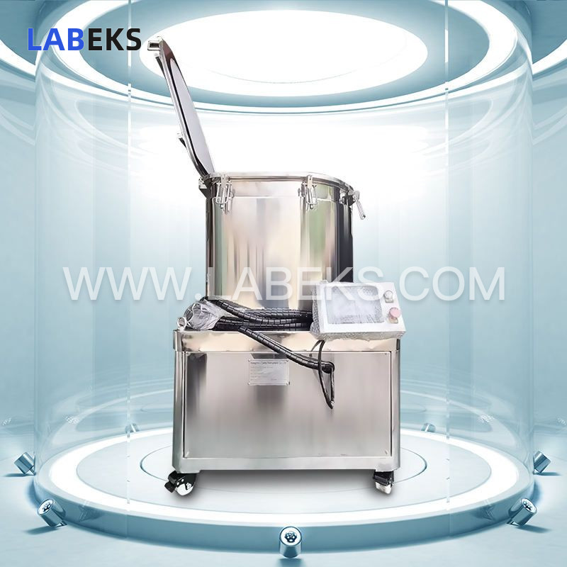Operating Principle: A filter screen is positioned inside the housing, followed by a layer of ice and the target plant material, then topped with a second filter screen. The motor drives the transmission assembly to rotate the inner mechanism; driven by paddle-mounted force from the unit’s base, the extraction kettle’s unique geometry generates cross-flow turbulence, creating intense stirring force within the housing. Free from plant particle contamination, trichomes separate rapidly from the host plant and remain suspended as insoluble solids in water. Once the water-trichome slurry is separated from leftover biomass, it can be easily filtered, collected, and dried to obtain high-quality hash.